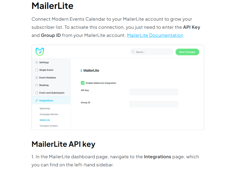 Webnus also provides you with very well written documentation on how to connect MEC to MailerLite.